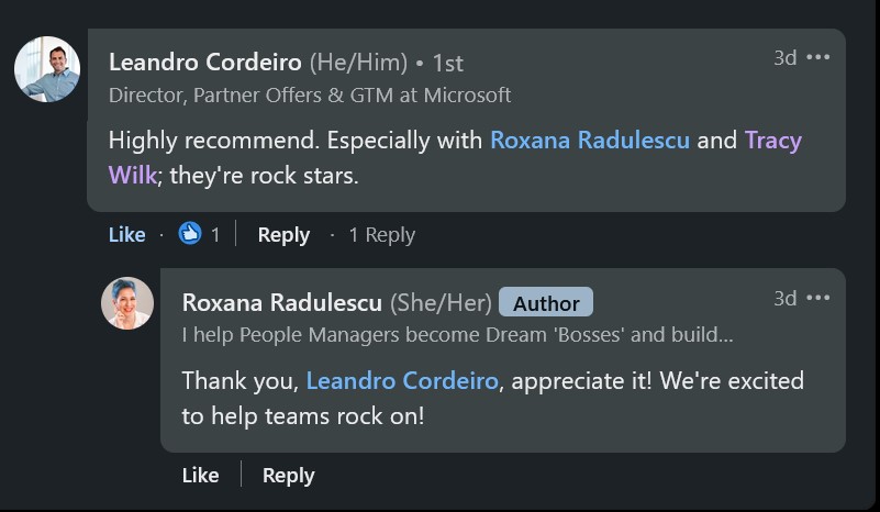 Had an absolutely stellar coaching engagement with Roxana Radulescu and Tracy Wilk over the last few months.